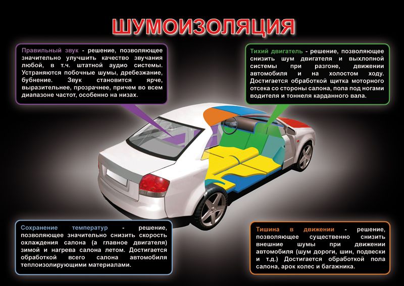 Изучив посекционно проблемные точки в автомобиле, необходимо определиться с потребностью в отдельных мерах по борьбе с шумом либо провести комплексную обработку поверхностей, подверженных негативному воздействию. Попробуем в сжатом виде представить основные способы и средства обеспечения акустической безопасности в каждом из представленных месте.