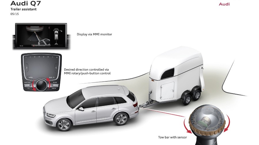 Для начала нужно сразу понять, что езда на Audi Q7 с прицепом – это работа целого комплекса систем. Для работы этого узла используются такие элементы как видеокамера, парковочные датчики, прицепное устройство, а также различные вспомогательные блоки управления. Сам фаркоп имеет функцию складывания и раскладывания. Этот процесс осуществляется путем задействования приводного автоматического механизма. Шаровая головка фаркопа имеет специальный датчик, который определяет угол положения прицепа по отношению к машине.